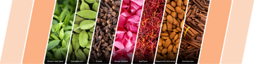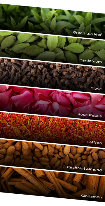 Green tea leaf, Roasted almonds, cinnamon, cardamom, clove, saffron, rose petals