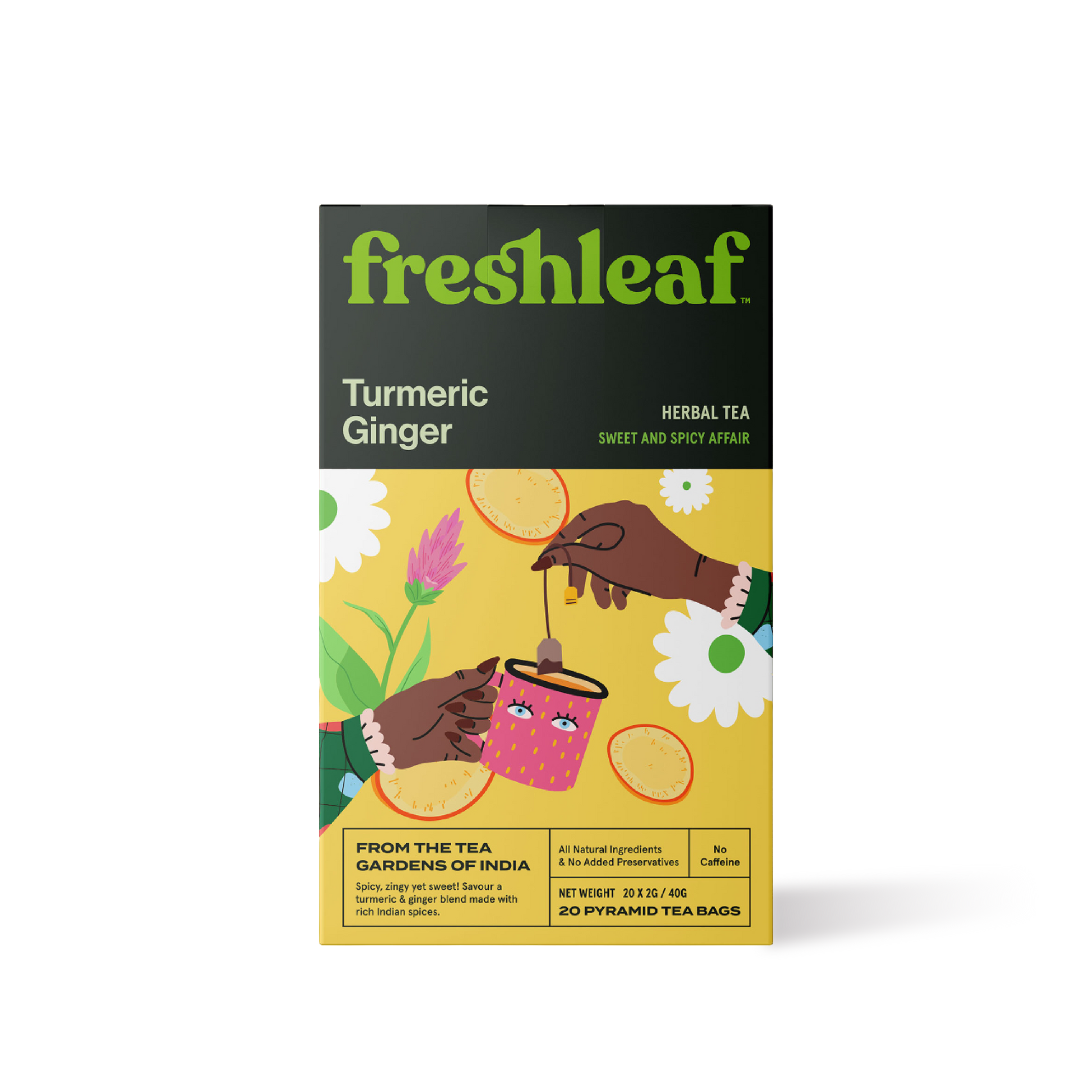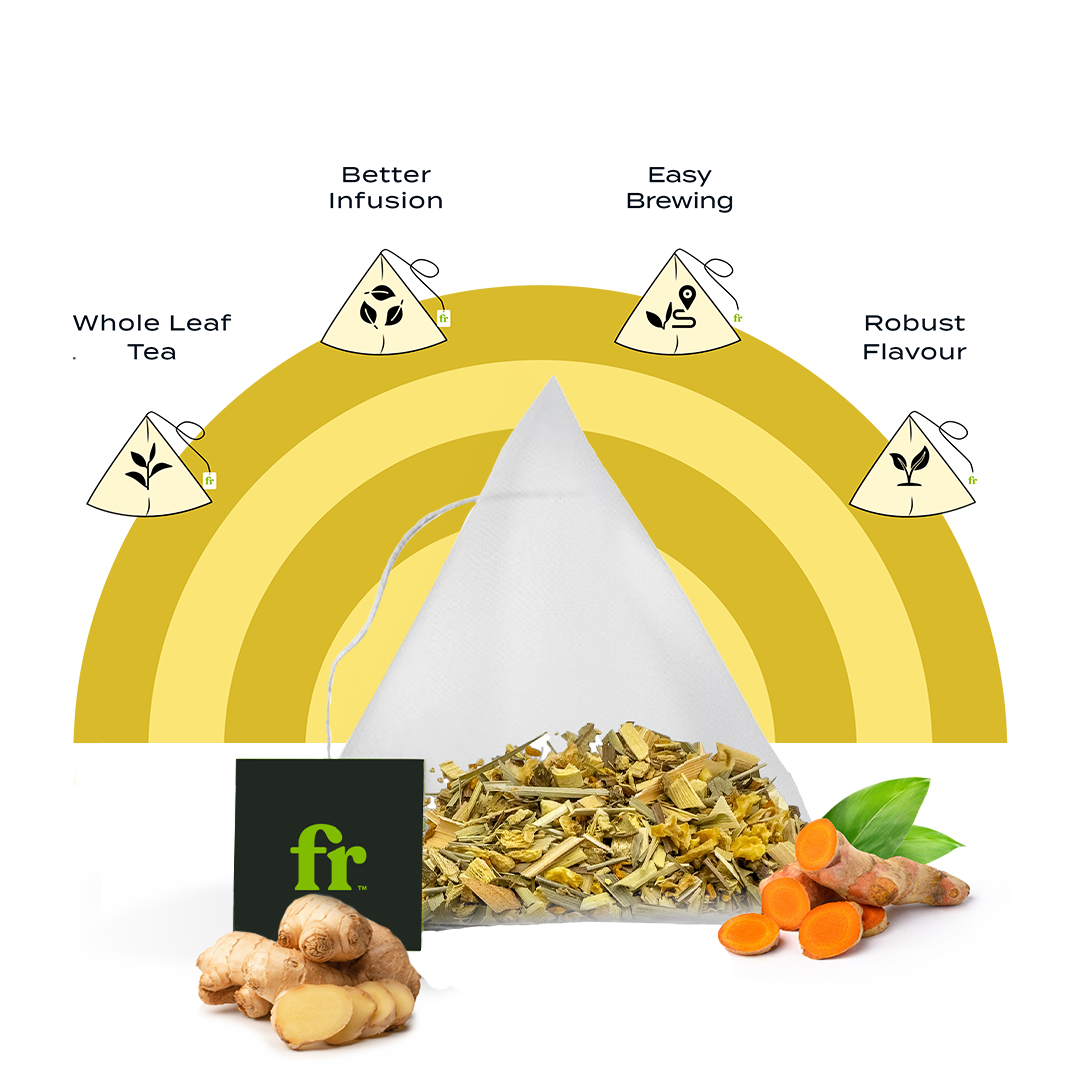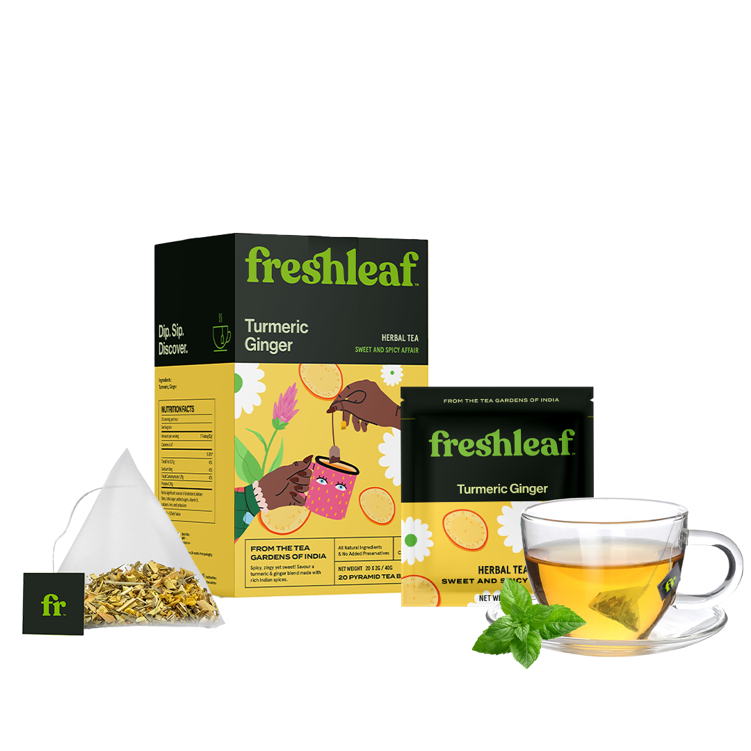 Delight in the fiery ginger and warm, earthy turmeric notes of Freshleaf's Turmeric Ginger Tea - a flavor duo that will spark your senses.